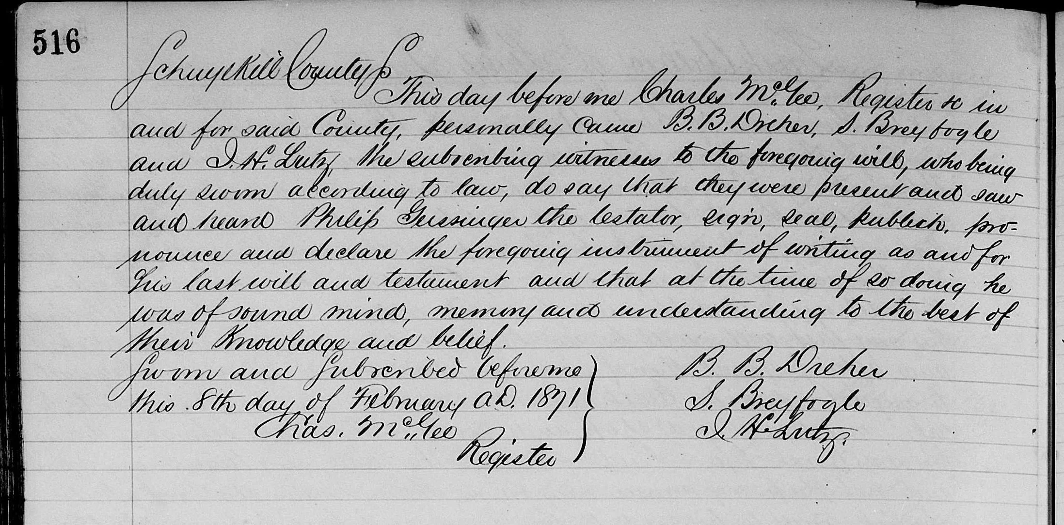 "Pennsylvania, Probate Records, 1683-1994," images, FamilySearch (https://familysearch.org/ark:/61903/3:1:3QSQ-G9S9-HGL4), Schuylkill > Wills 1863-1883 vol 3-5 > image 289 of 1085.